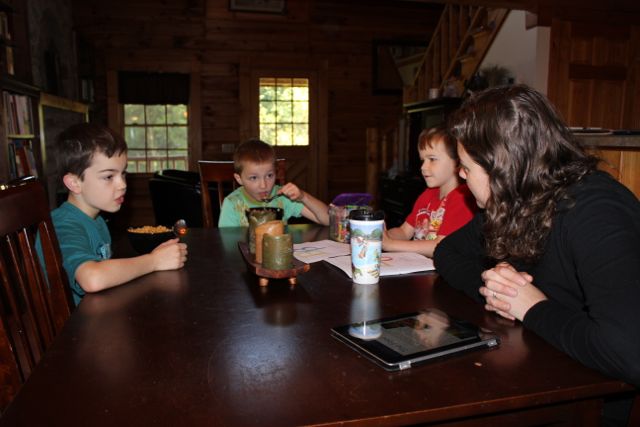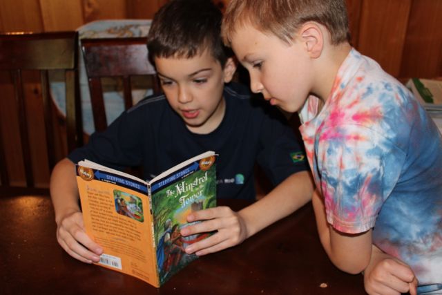 1:00 PM: David and I read The Making of a Knight together while Stephen listens. {Gary and Levi are out running errands now.}