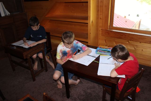 9:15 AM: David & Stephen start notebook time. Levi has wandered into the toy room (I think).
