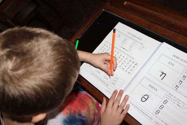 Levi decides to color some of his Greek alphabet before breakfast.