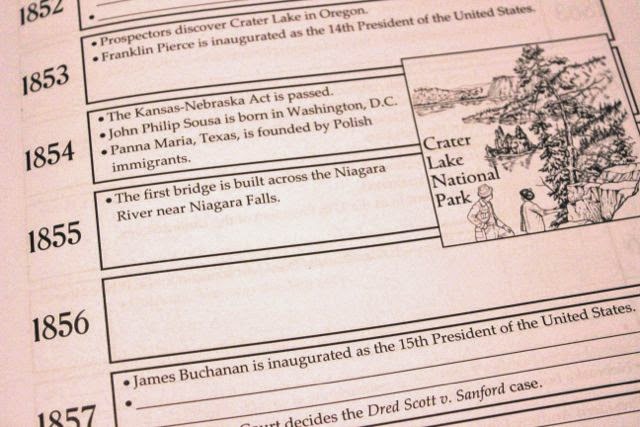 - adding an event to the Timeline of America the Beautiful book, an illustrated timeline of U.S. history from AD 1000 to the present day, which correlates specifically to each lesson. (Click here to view sample pages.)