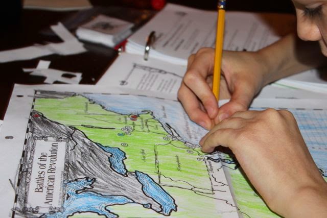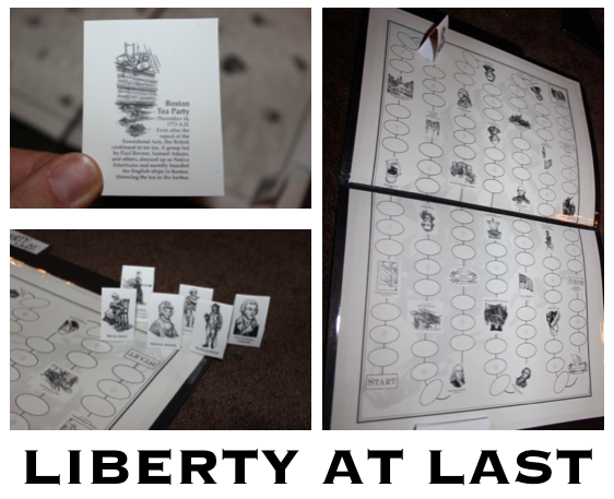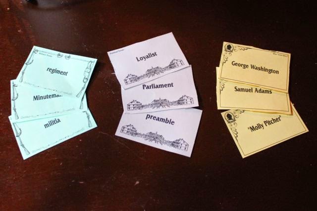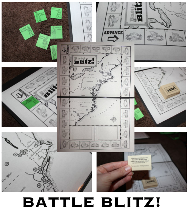 In Battle Blitz! we drew trivia-style cards to review the events/people/places/battles of the American Revolution. As we went around the board, we reviewed the order in which the battles were fought and were able to locate the place of those battles on the gameboard map.