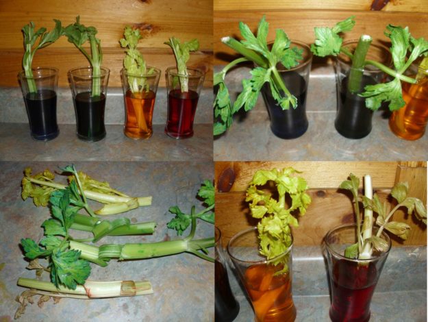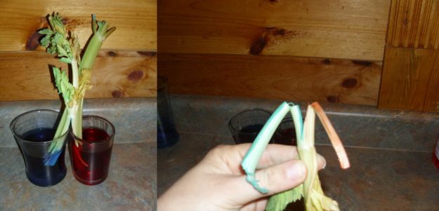 We also wanted to see how the individual veins in one celery stalk would transport water. We split one celery stalk and put one side in blue water and the other in red water. When we broke the stems apart, we actually had some of the veins popping out of the plant. (An aside: Would you believe that my Essentials-laden son was looking over my shoulder just now pointing out the fact that I started more than one sentence here the same way! I’m having a funny feeling right now – a cross between exasperation… and elation!)