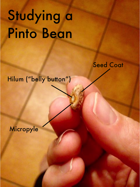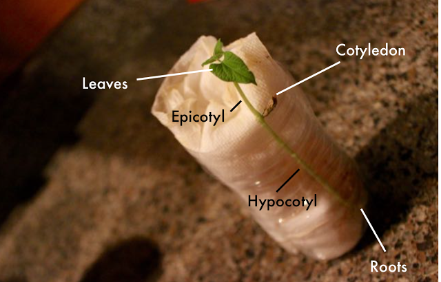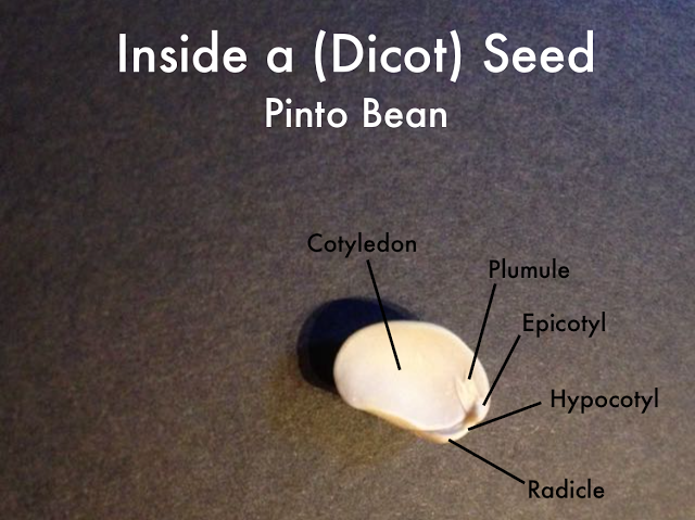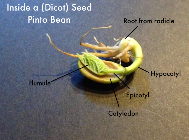 As we continued to grow a different bean, we observed firsthand how the cotyledons (pinto beans have two, hence the term “dicot”) provide just enough food for the baby plant until…