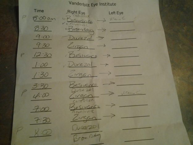 My husband had this list – a schedule from 8:00 AM to 10:00 PM – what to put in my eyes and when, all at 30-minute intervals. Plus the oral medications. It was pretty detailed, with me being an “exceptional case” for whatever reasons. My husband – He was a rock-solid trooper through it all. This is a photo of the updated list – when the doses were finally spaced a bit farther apart. Understandably, he threw away the first list as soon as they said he didn’t have to follow that schedule anymore. (It was much more formidable than this.)