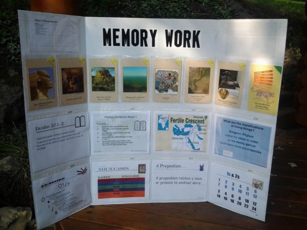 - We sing along with our memory-work songs for new memory work and practice the timeline from Creation up to the current week’s memory work using hand-motions. At times, we’ve used a Memory Work Tri-fold Board.