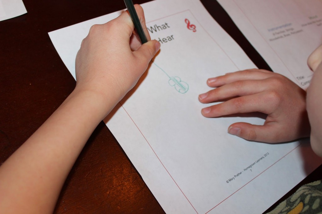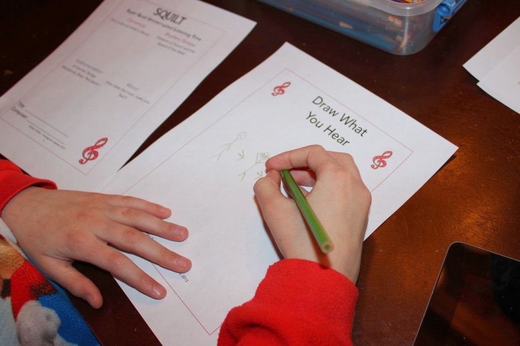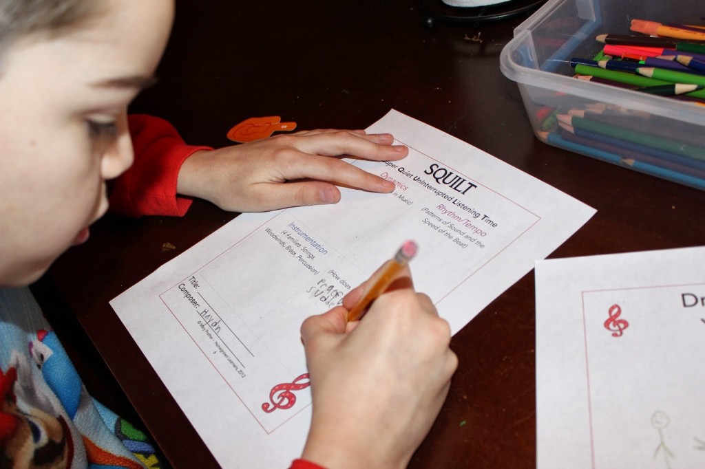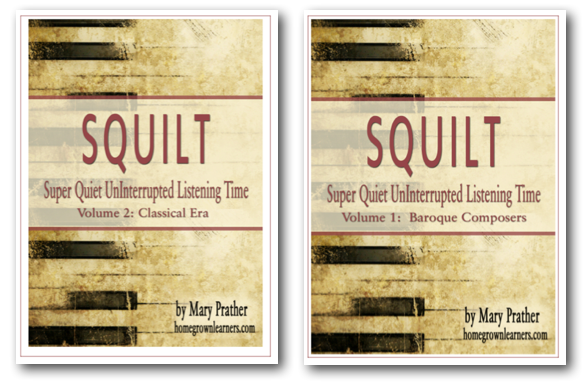 It teaches us to actually study the elements of music. We are learning about the dynamics, rhythm, tempo, instrumentation, and mood of music. Although we can use the SQUILT printable with any piece of music, the SQUILT lessons for each specific piece help a musically-challenged mom (like myself) hold an intelligent discuss with my children. I’m hoping that as I use the more scripted SQUILT lessons, I will be more equipped to tackle new pieces using the SQUILT page on new unscripted pieces with my children. Right now, I’m learning the grammar of it all!