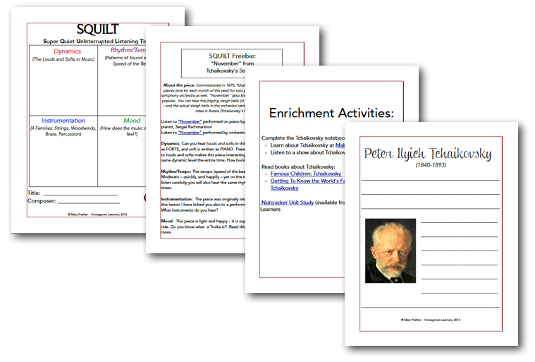 Then… I came across this Free Tchaikovsky SQUILT Lesson. It was offered by another homeschoolin’ mama, Mary, who blogs over at Homegrown Learners. I decided to find out more about this “SQUILT” thing in hopes that we would perhaps-maybe-actually use it.