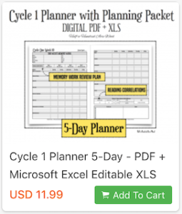 Check out our Script-n-Scribe cursive program, our faith-based missions curriculum guides, our science and fine arts resources (Rocks & Minerals and Great Artist Picture Study Packet), our Cycle 1, 2, and 3 planners with correlations & booklists (which have been updated to 5th Edition), and more. Click on the images below to view details and download samples. Let us know if you have any questions!