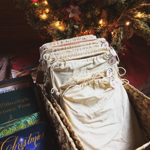 We’ve enjoyed the books even more as we look forward to the surprise of which one might be next! We’ve used these 10×12″ muslin bags for our smaller books, but then we found some similar to these 12×16″ muslin bags which fit a much wider range of book sizes. You may even opt for these red muslin bags or just a set of regular drawstring gym bags. We used simple tags available at Walmart or any store that carries basic office supplies, but I also found these lovely pre-numbered gift tags.