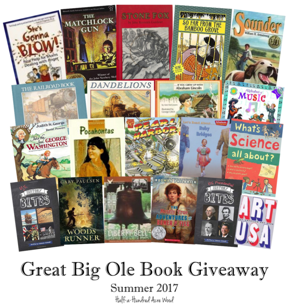 Hot dog! That’s 20 books that we’re handing off to another family this year! This giveaway has ended. Thanks to everyone who entered! The winner of the giveaway is… Sarah R. Congratulations, Sarah! Check your inbox from an email from me. 🙂