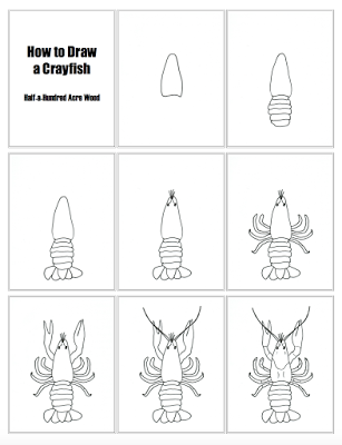 For me, when drawing from a specimen, it can be difficult to know where to start. When I contemplated ways to help other parents/students with both the anatomical terms and the drawing of a crayfish, I kept searching the Internet for something I could not find, so… I made an attempt here to draw up something that might help. It has not yet been tested, but I thought I’d share it in case others are looking to draw a crayfish while identifying its anatomy.