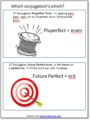 - 1st Conjugation Pluperfect Tense: Tapping eram, eram, eram on my pluperfect drum. (a in Latin is pronounced like the a in idea.)