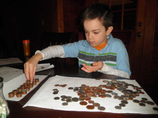 We interrupted our normal math routine because I landed on a site called Three Jars (which is no longer an active website) to assist children in budgeting. And because we are trying to be more intentional about “living” math in our home, I seized the opportunity for the boys to once again count their coins.