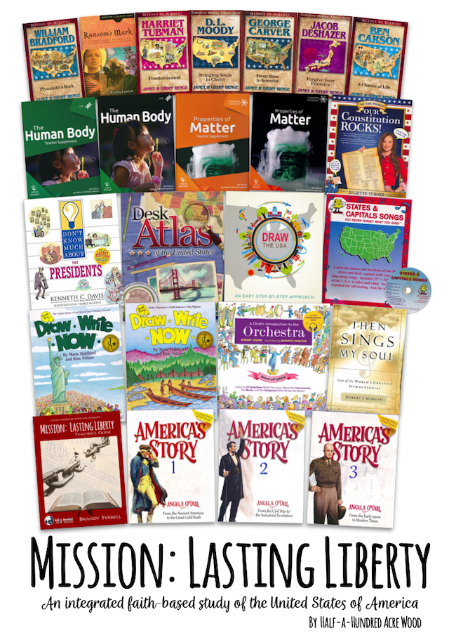 Format: Set of 24 physical resources, plus a PDF of the Mission: Lasting Liberty Teacher’s Guide. Physical resources include America’s Story 1, America’s Story 2, America’s Story 3, Don’t Know Much about the Presidents, Our Constitution Rocks!, Desk Atlas of the United States, States & Capitals CD + Map Kit, Draw the USA, God’s Design for Life Set: Student Text & Teacher Guide, God’s Design for Chemistry & Ecology Set: Student Text & Teacher Guide, Draw Write Now Book 3, Draw Write Now Book 5, A Child’s Introduction to the Orchestra, Then Sings My Soul, William Bradford: Plymouth’s Rock, Ransom’s Mark: A Story Based on the Life of the Pioneer Olive Oatman, Harriet Tubman: Freedombound, D. L. Moody: Bringing Souls to Christ, George Washington Carver: From Slave to Scientist, Jacob DeShazer: Forgive Your Enemies, Ben Carson: A Chance at Life. Access to our exclusive Mission: Lasting Liberty Supplemental Resource Webpage is included with purchase.