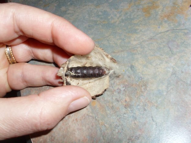 Do you see the eggs? There are hundreds to thousands of them encased in that dark, wormy-looking thing. Do you see the silk? That’s a gift from mama moth, too.