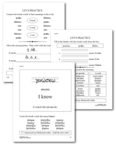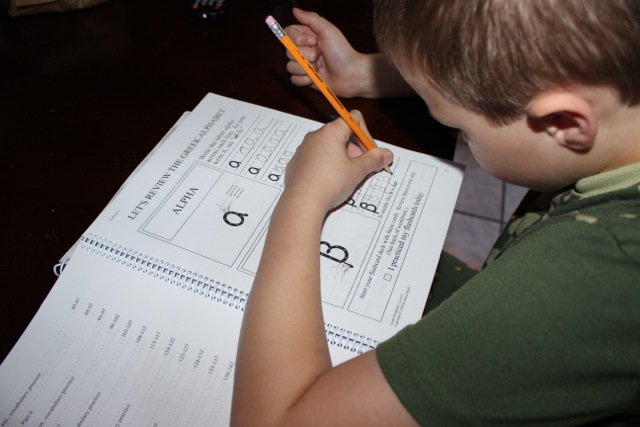 Our 10-year-old and 7-year-old have been working through Level 2 of Hey Andrew! Teach Me Some Greek! I am still waiting to start our 4-year-old in Level 1 because he is still mastering how to write his English alphabet. (Okay, okay… maybe he is just mastering the art of holding a pencil right now. But we’re getting there!) He does have his own set of Greek Alphabet Coloring Pages to use along with the Hey Andrew! Teach Me Some Greek! Reader. (Note: Even if you’re new to teaching Greek, Level 2 is a great place to start because it reviews the alphabet before proceeding into learning your first Greek words.)