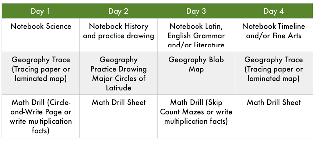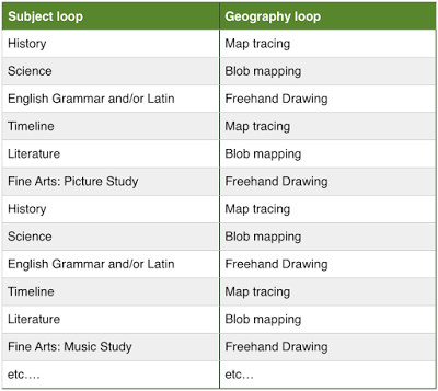 The loop schedule allows you to cycle through the tasks you’d like to do without worrying about totally missing out on “Fine Arts Friday,” for example. If you don’t get around to fine arts on Friday, just do it on Monday. Even though I have plans scheduled into our planner, we often fall “behind schedule” because of illness, drama rehearsals, field trips, dentist appointments, or Distractible Mom Syndrome. In this case, we just pick up where we left off the next day and don’t worry about not getting it finished on a particular day. If this loop scheduling thing is of interest to you, be sure to visit this post which explains it in further detail.