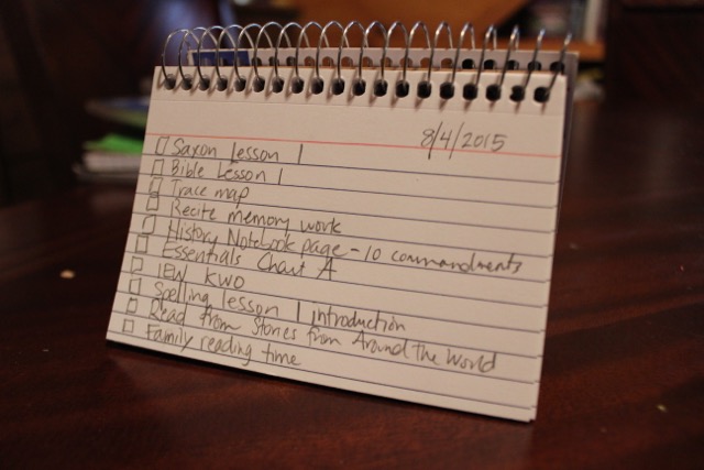 Then there’s the very act of writing down the student’s daily assignments, which can be done on spiral notebooks as well. (We use a spiral index card notebook because my children like it, but it makes better sense to use cheap spiral notebooks that provide you an entire page to write out details.) In preparation for a new day, I usually plan out the next day’s activities for each of my children. Using a few minutes the night before to plan out the following day falls in line with the idea of starting your day in the evening. (“The evening and the morning were the first day.” Genesis 1:5)