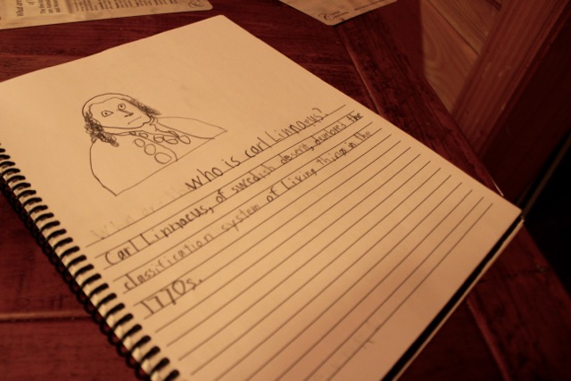 That’s seven (or eight) subjects, and those seven (or eight) subjects constitute our normal daily memory work. However, those are not the only subjects for which we use this simple technique of writing-on-paper. For instance, there’s art and composer study. While it can be useful to have a printable with staff lines for music theory study, or a notebook page with a composer’s portrait or an artist’s work (especially if you don’t have the artwork available in another form), you can still use plain paper to write about an artist’s biography or to trace an artist’s work. In listening to classical music, our children simply draw what they hear on a blank sheet of paper as we talk about instrumentation and dynamics. We also have the other language arts (literature, vocabulary, and spelling), all of which can be included in the same notebook. In fact, keeping a literature notebook is a great way to keep up with characters, setting, quotes, and other elements of a story.