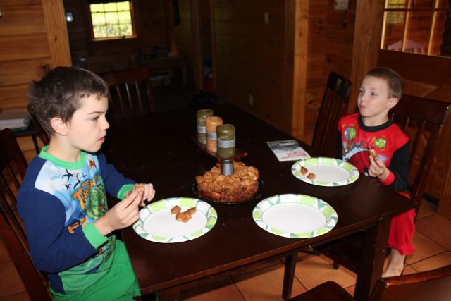 On our first day of school, the boys woke up to a “special” breakfast of Monkey Bread to mark a “special” day of starting anew. [Any time we have a sugary-sweet breakfast like this, it’s a “special” breakfast because I don’t normally cook sugary-sweet stuff for breakfast.]
