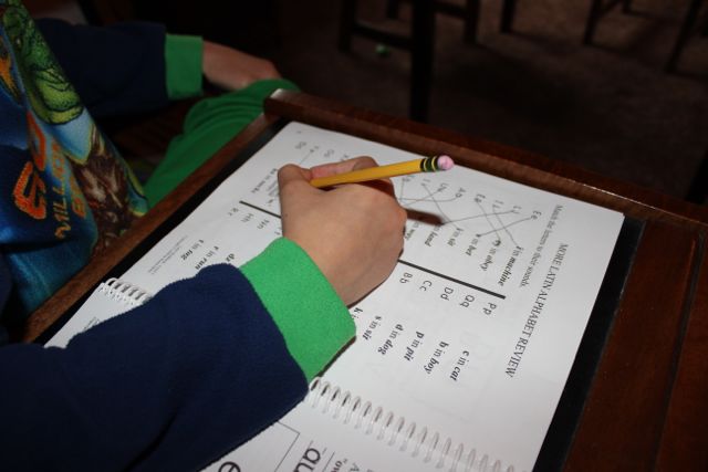 Stephen’s notebook has multiplication-math-fact-practice drills, and Levi’s has writing-numbers-and-letters sheets – both are from PrintNPractice.