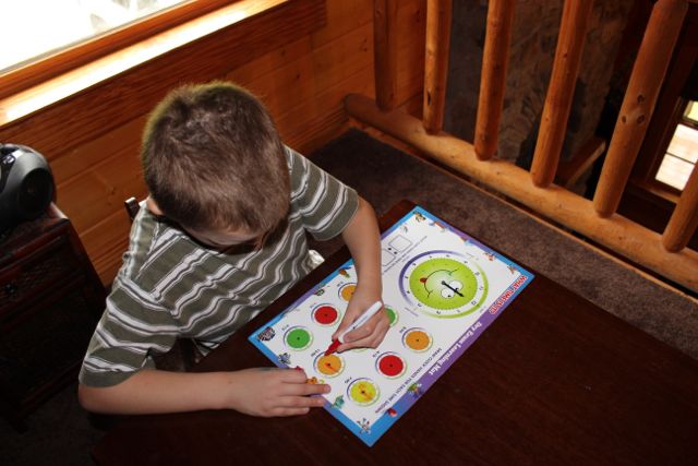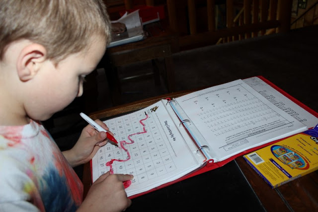 What’s going on with Levi during this time? He’s working in dot-to-dot and color-by-number books and simply learning to write his numbers and letters. And he plays a lot with his construction tools when I am focusing on the other two.