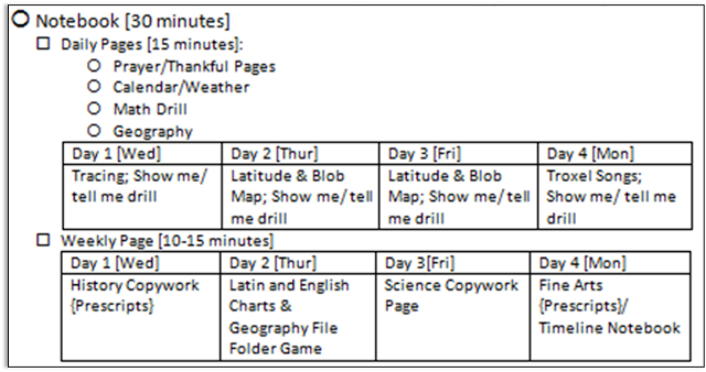 I didn’t capture photos of us working on each section, but it takes about 30 minutes to go through the tabs in our notebook, which includes map practice. Here’s our schedule of how we use our classical notebook.