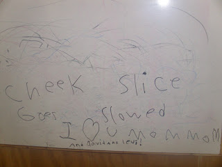 The benefits of this program are that it is a complete program including mastery of the top 5,000 most frequently used words, the student only studies the words he/she does not know, and it has many hands-on activities for the student. Stephen enjoyed writing his words outside with chalk and on the board in our schoolroom. (I always enjoy finding the little messages written when he’s doing something like this…)