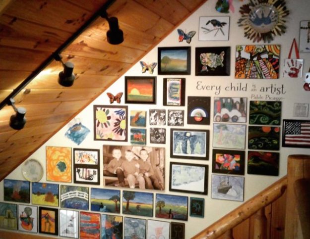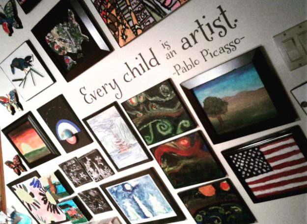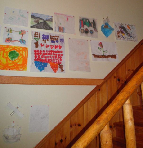 We recently updated the art gallery to include some of our new art projects. While going back through some old posts, I found a photo of the art gallery when we hung up our first masterpieces…