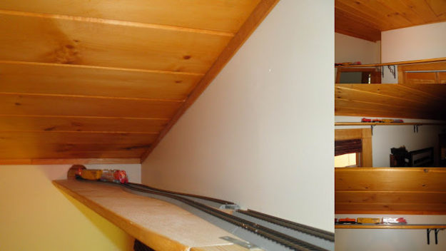 Gary finally finished the shelving in the boys’ rooms, and now the train is running – all the way around David’s room and through the wall into Stephen’s room and back!