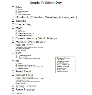 First, there’s the cover…. the school work checklist. Though it looks formidable, it actually takes us step-by-step through the entire day. And there’s something euphoric about checking the boxes on a checklist. (Why else would I add things to my to-do list that I have done, just so that I can check that little box? The boys love checking those little boxes, too.)