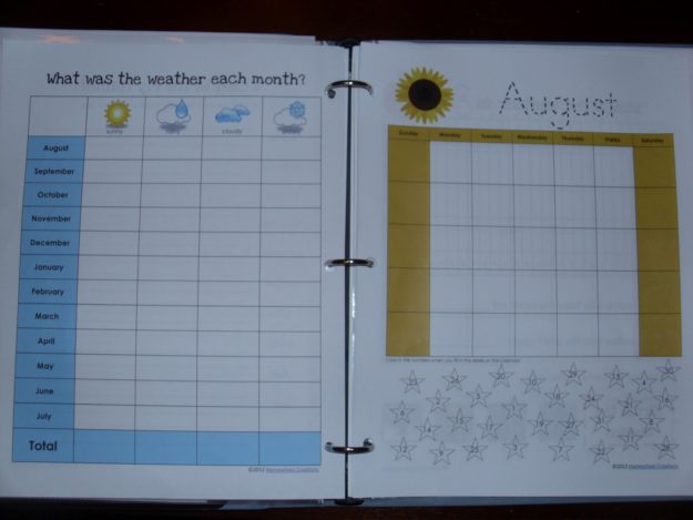 Calendar, weather chart, and copywork pages are consumable. Most everything else is in page protectors so that we can use wet-erase markers for everyday practice. Our notebooks are a concoction of printable resources from our website and calendar templates from other websites as referenced.